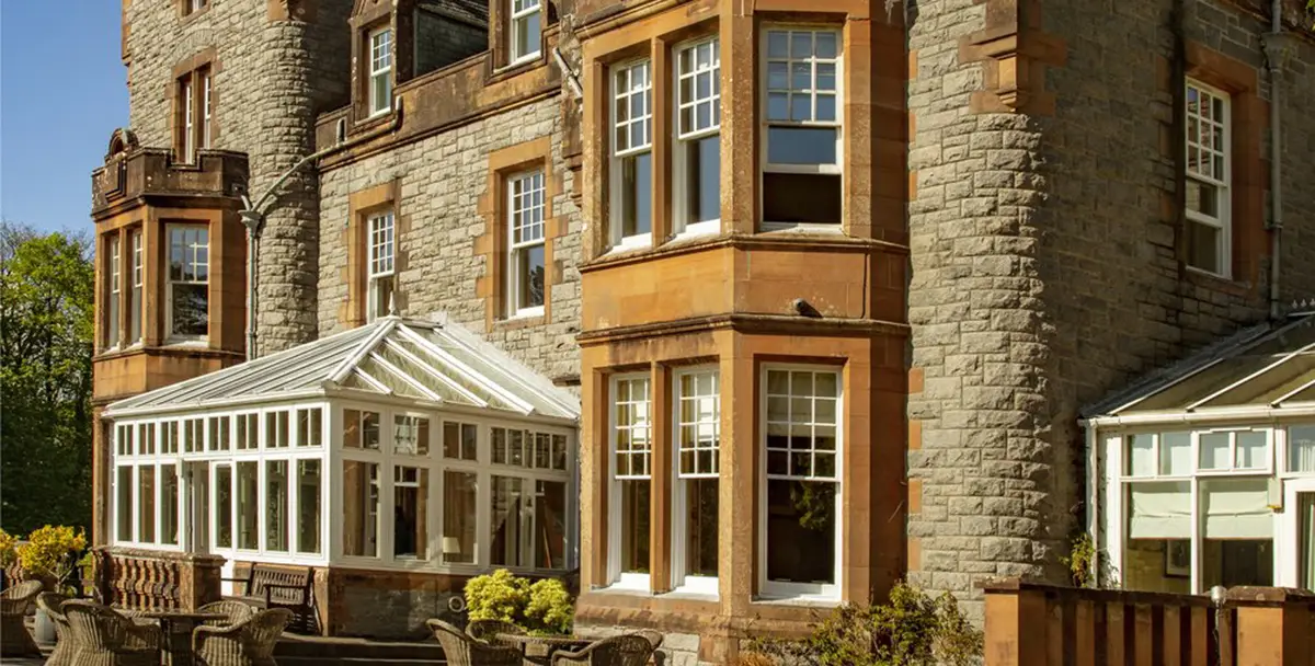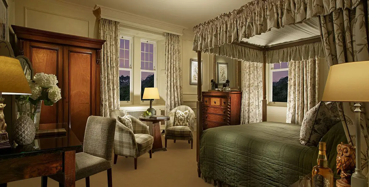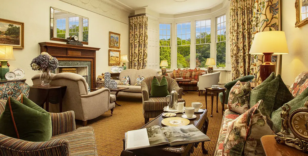 The public rooms at Eriska exude comfort and the warmth of hospitality you would expect from a house of this era and yet do not over formalise the areas. Open fireplaces dominate the ground floor, none more so than in the hall where the fire burns constantly every day of the year. The main hall was wood panelled in 1913 with Burr Oak to conceal the new wiring in the hotel. The Piano room is the first room entered from the front door and is light and bright as is the drawing room which has soft bright furnishing and sofas and chairs which would tempt any visitor to simply relax and set their mind at ease. The Library has changed minimally since the turn of the century with an art deco fireplace with very risqué, in those days, figurines dressing the edges of the fireplace and a wonderful selection of whiskies, cocktails and house wines available throughout the day.